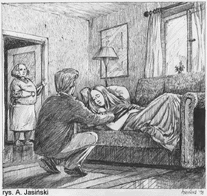 półmrok bramy wciąż z dziewczyną na rękach - teraz już śpiącą - odszukał