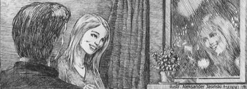 ku swemu zdziwieniu natknął się w szybie na jej oczy wpatrzone w jego odbicie. Nie