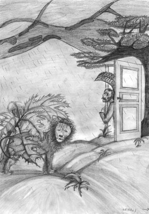rozejrzał się. Padało. Wielki, płomienno rudy lew schronił się pod rozłożystą