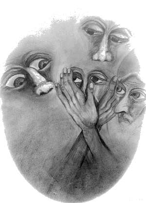Te twarze bez wyrazu, puste oczy. Dreszcz wstrząsnął spazmatycznie jego ciałem. Odruchowo wsparł się o ścianę budynku, wyciągnął przed siebie ręce. Byli coraz bliżej. Szeptali : "Wiemy. Wiemy. Wiemy...". Czuł ich zimne oddechy na swoich policzkach. Wciąż powtarzali patrząc mu w oczy, jak w hipnotycznym transie: "Wiemy. Wiemy...". Byli blisko, tak blisko, za blisko. Twarze jak z wosku, spuchnięte powieki. Oni... wiedzieli! Duszno, ciężko, ziemia. Nieeeeeeeeeeeeeeeeee....
