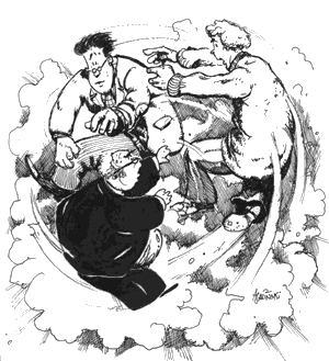 | | Ilustracja: Aleksander Jasiński | Zaklęty, ponieważ parający się jakąkolwiek formą fantastyki autorzy, wydawcy i odbiorcy wpadli w konformizm: w pułapkę oklepanych pomysłów naukowych, pomysłów na historie, w schematyzm gatunkowy, w sidła masowych uproszczeń o fantastyce, w okowy jej stereotypów. To wszystko kreowane jest przez wszystkich ich poprzedników. To fantastyka - podobnie jak kultura - masowa.